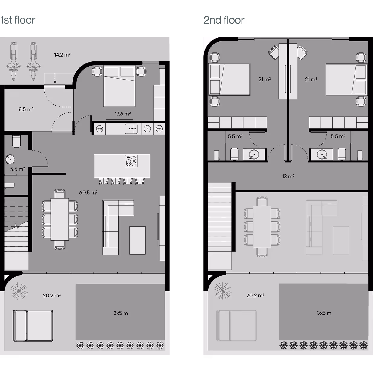 清晨,在露台上喝杯咖啡。柔和的色彩、柔软的面料和漫射光线为起居和用餐区带来舒适和温暖。